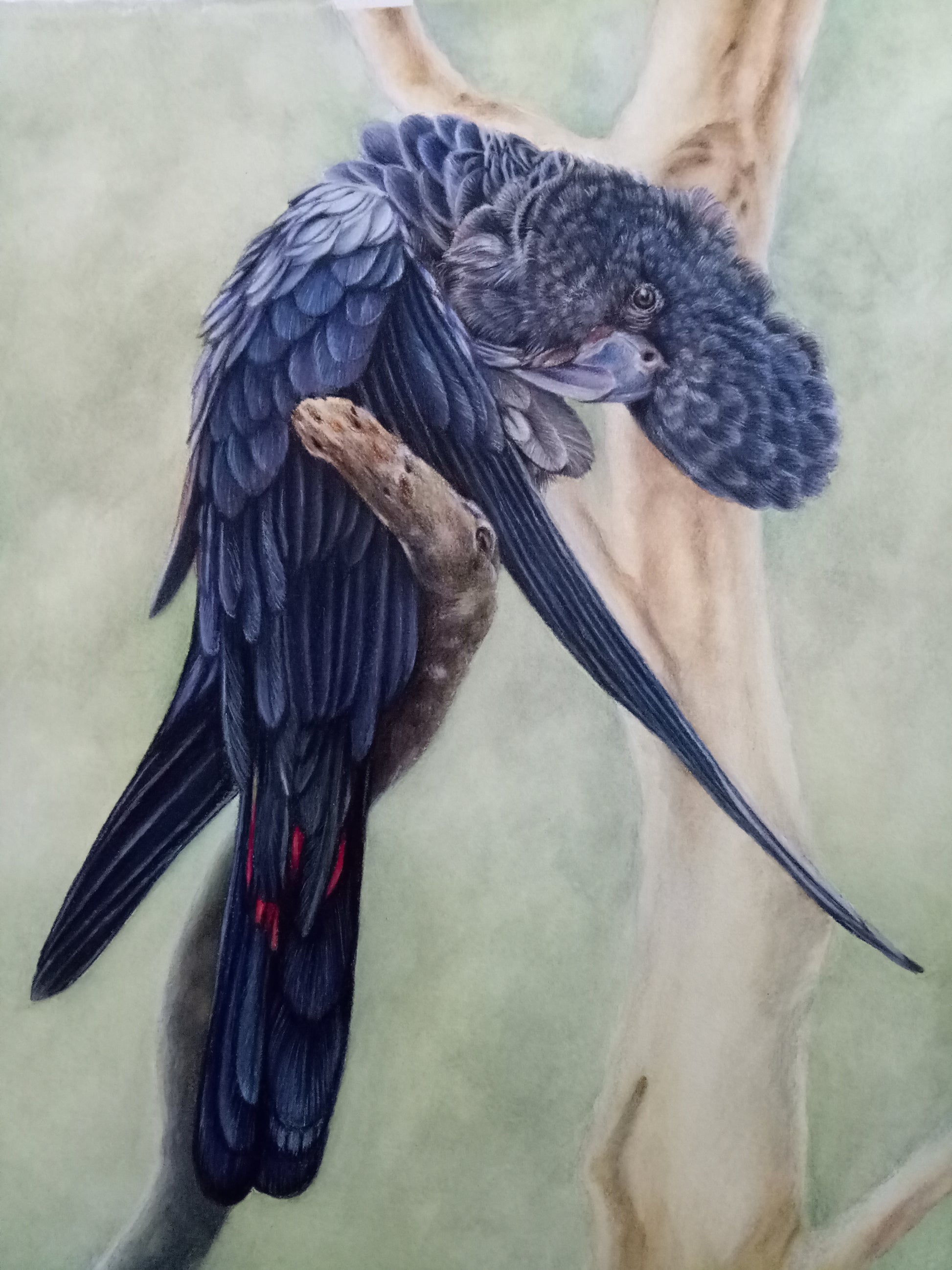 Original watercolour and colour pencil drawing of an Australian Black Red Tail Cockatoo.